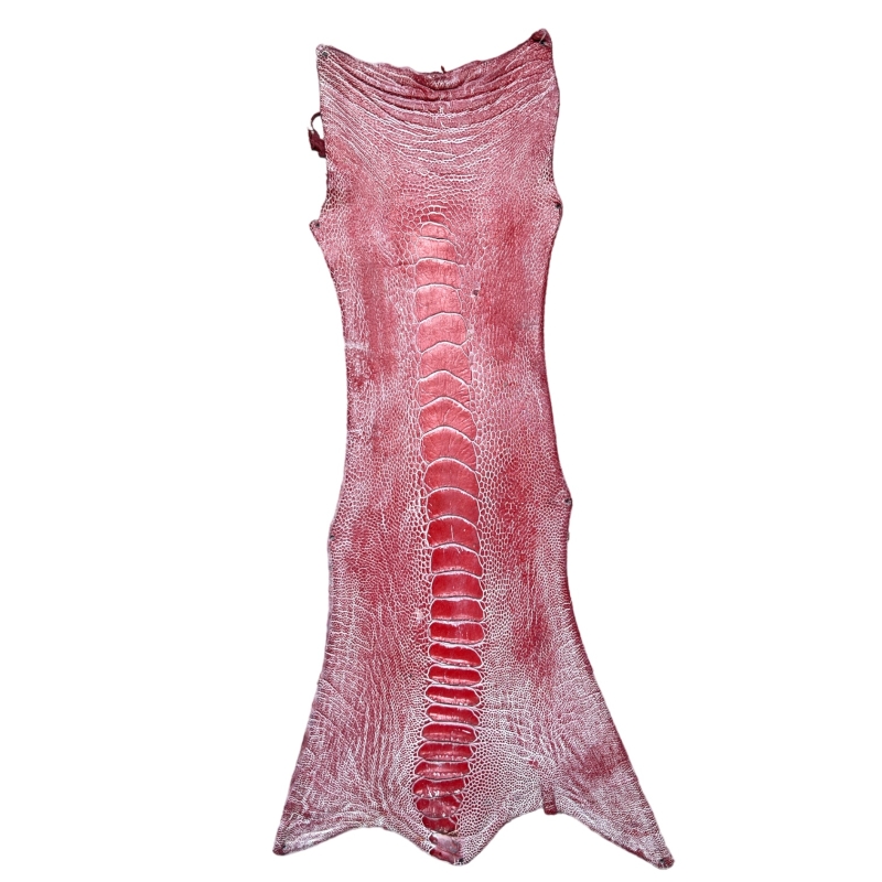 Straußenbeinhaut zeichnet sich durch eine markante Mittelstruktur aus, die ihr ein exotisches, schuppenähnliches Aussehen verleiht. Die Oberfläche ist glatt und leicht glänzend. Jede Haut ist in Muster und Form einzigartig – ideal für kleinere Lederprojekte mit auffälligem Charakter.